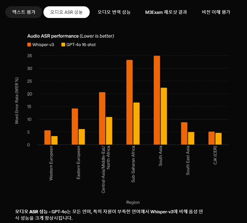 (새 창에서 열립니다)대화 중. 영어 및 코드 텍스트의 GPT-4 Turbo 성능과 일치하며, 영어가 아닌 언어의 텍스트에 대한 상당한 개선이 이루어지며, API에서는 훨씬 빠르고 50% 저렴합니다. GPT-4o는 특히 기존 모델에 비해 시각 및 청각 이해도가 더 뛰어납니다.