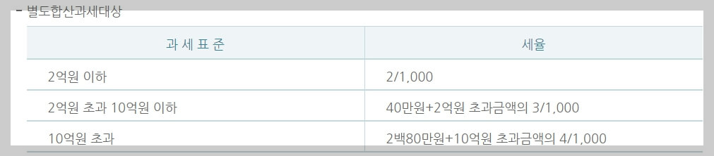 | 과세표준 3천만원 이하: 0.2% | 3천만원 초과 ~ 1억5천만원 이하: 0.3% | 1억5천만원 초과: 0.5% |