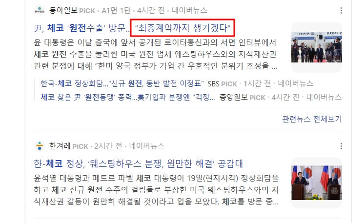 윤석열 대통령과 페트르 파벨 대통령은 9월19일(목) 프라하성에서 한국-체코 정상회담 후 공동기자회견을 하였고. “체코와 원전 모든 절차에 있어 협력할 것이기 때문에 '원자력 동맹'이 구축될 수 있을 것”특히 “원전 수주 계약이 절차를 밟아 (최종 계약이) 체결된다면 양국의 경제산업 협력, 과학기술 협력을 한단계 도약시키는 길이 될 것”이라며