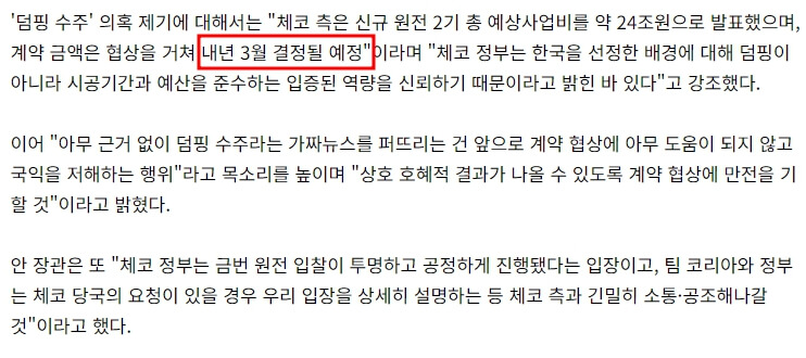 '덤핑 수주' 의혹 제기에 대해서는 "체코 측은 신규 원전 2기 총 예상사업비를 약 24조원으로 발표했으며, 계약 금액은 협상을 거쳐 내년 3월 결정될 예정"이라며 "체코 정부는 한국을 선정한 배경에 대해 덤핑이 아니라 시공기간과 예산을 준수하는 입증된 역량을 신뢰하기 때문이라고 밝힌 바 있다"고 하였습니다.