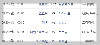 손흥민이 소속되어 있는 토트넘(잉글랜드)의 가까운 경기일정을 안내드립니다.